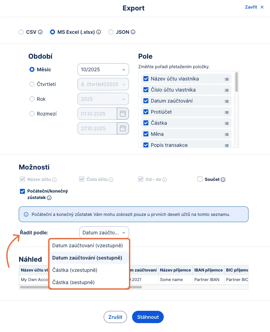 Transakce si můžete seřadit podle data nebo částky – sestupně nebo vzestupně. Získáte tak přehled přizpůsobený vašim potřebám a data se vám tak budou lépe zpracovávat.
