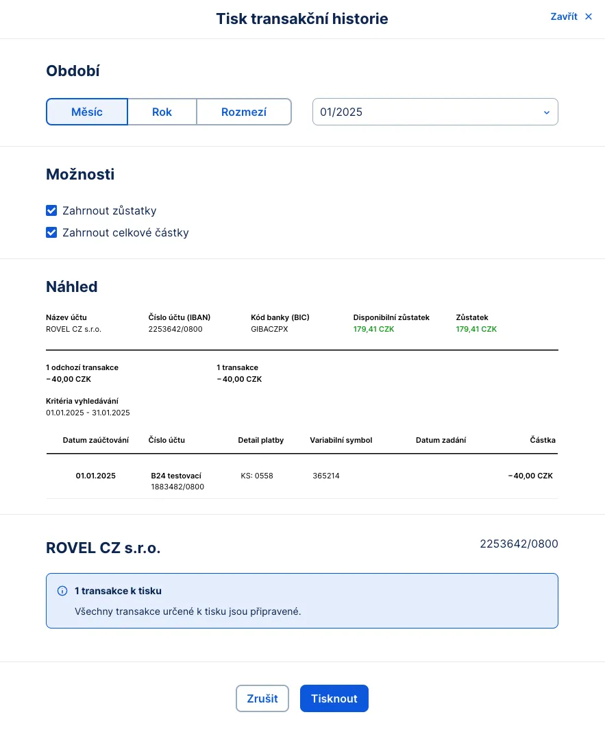 Vytištěné PDF zobrazuje transakce ve stejném pořadí jako v seznamu – tedy od nejnovějších po nejstarší. Pokud vám více vyhovuje jiné řazení, doporučujeme využít export. Ten umožňuje další pokročilé funkce – např. stáhnout transakční historii v různých formátech, jako jsou CSV, XLSX a JSON.